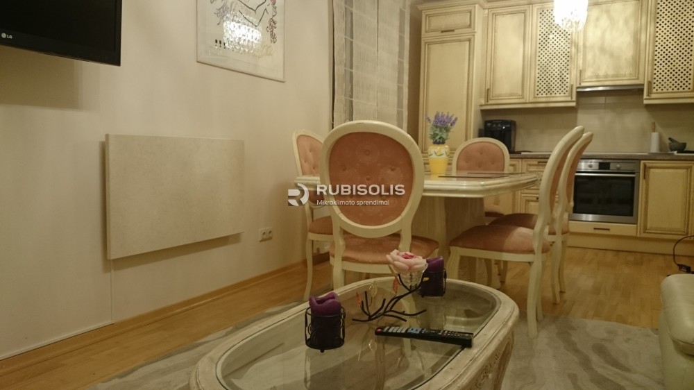 Salione (26 kv.m.) įrengti du radiatoriai po 1150W. Miegamajame (13,6 kv.m.) įrengtas vienas 1150W radiatorius. Mažajame kambaryje (10,6 kv.m.) įrengtas 850W radiatorius.