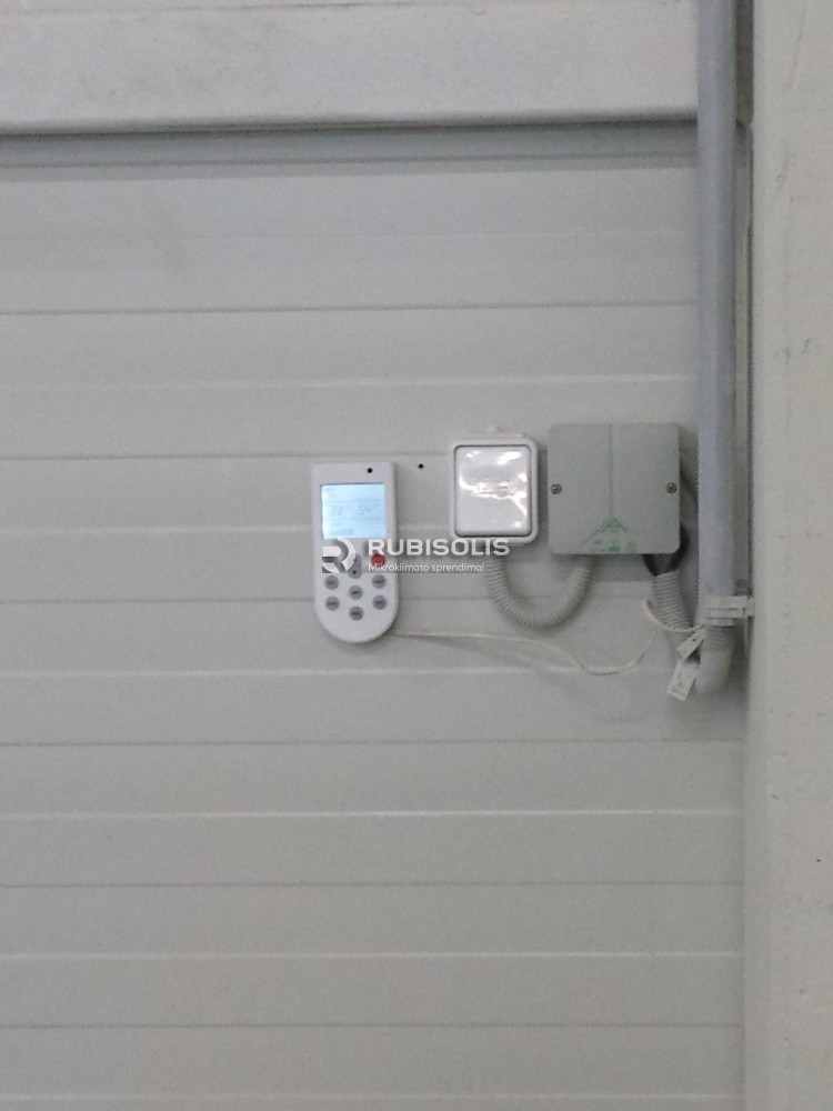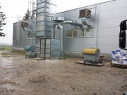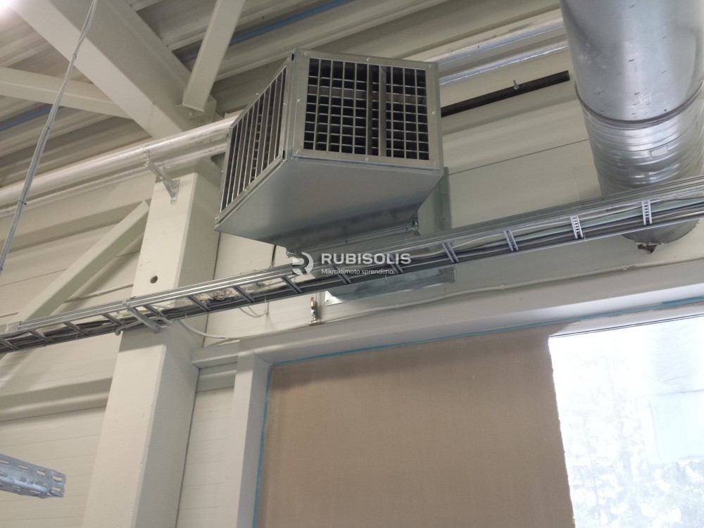 500 mploto, 4 m aukščio laminavimo ceche sumontuotas pramoninis vėsintuvas. Taip pat panaudotas dviejų krypčių difuzorius. Oro pasikeitimas patalpoje - 15 kartų.