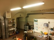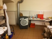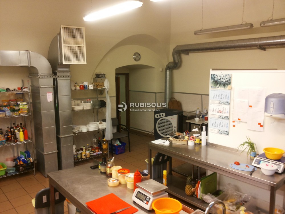 Virtuvės vėsinimas rūsyje mobiliu vėsintuvu Honeywell CO60PM. Virtuvės plotas - 60 m2, o aukštis - 4 m. Oro ištraukimui naudojami langai, esantys patalpos viršuje. Temperatūra sumažėjo 8 laipsniais ir oras tapo šviežias. Mobilus vėsintuvas taip pat naudojamas pagrindinėje salėje pokylių metu.
