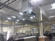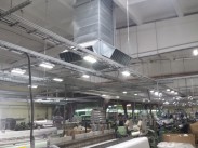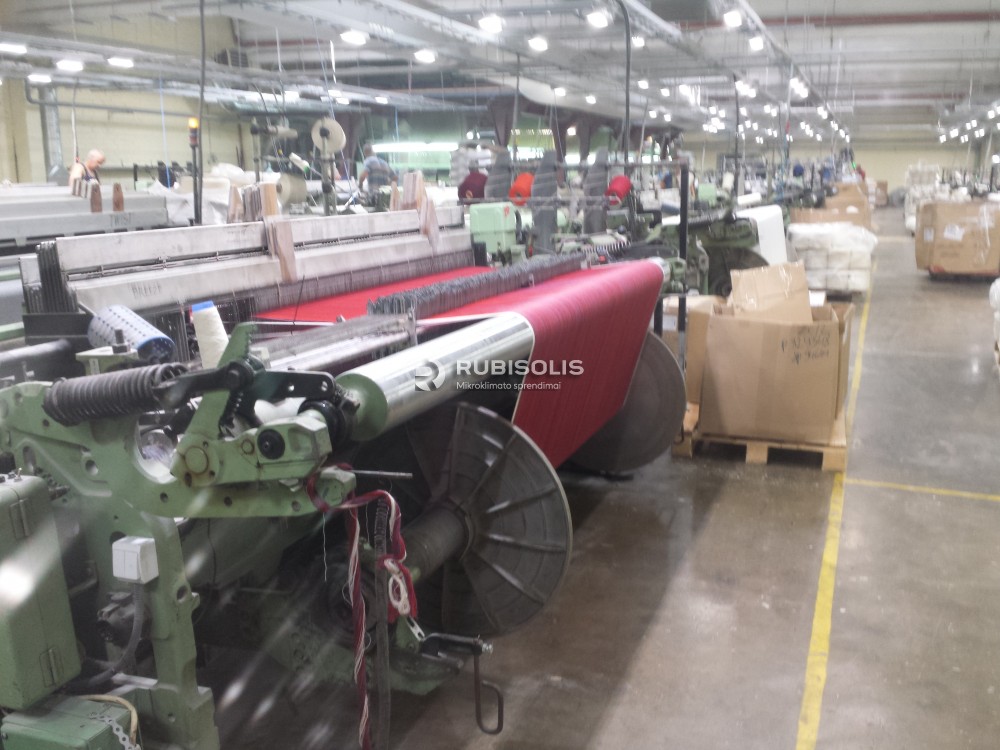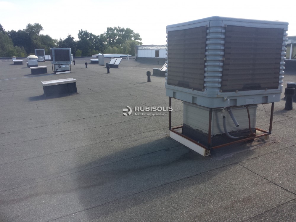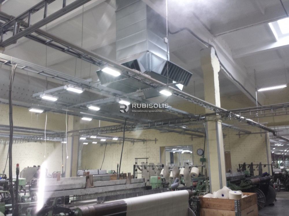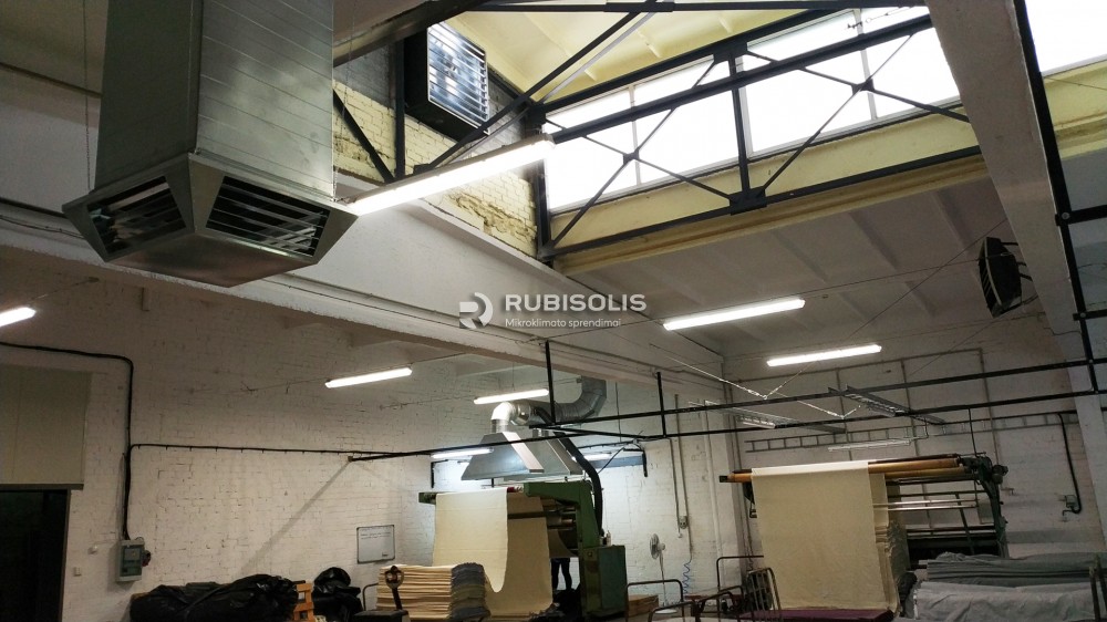 Siuvyklos vėsinimas pramoniniais vėsintuvais. Sumontuoti pramoniniai vėsintuvai Aircon, kurių maksimalus oro srautas 30 000 m3/h, ir pramoniniai ventiliatoriai (oro ištraukėjai).