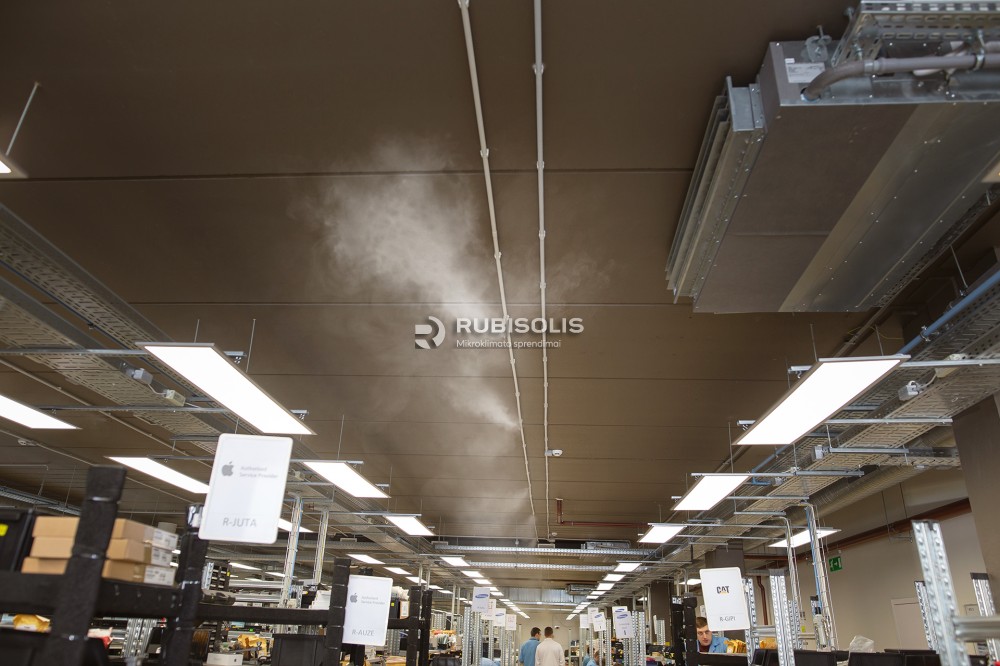 Oro drėkinimas telefonų remonto ceche naudojant aukšto slėgio drėkinimo sistemą "Idrobase".
