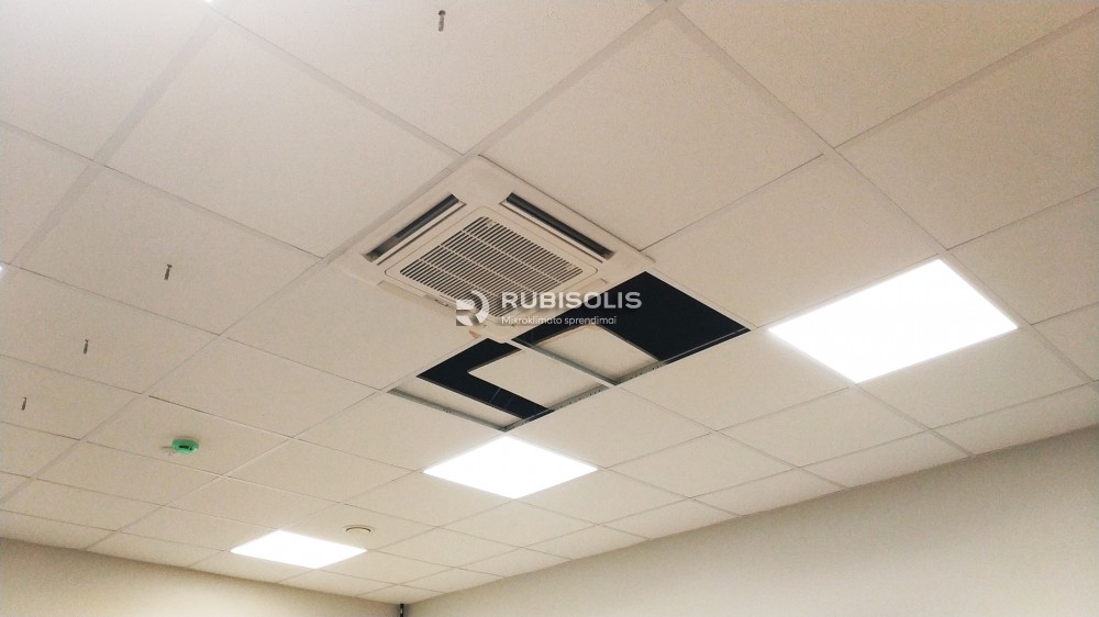 Oro kondicionavimas biuro ir laboratorijos patalpose naudojant rekuperatorių Aerauliqa QR 400 ABP ir mono-split sistemos oro kondicionierių Skyworth vidinius kasetinius blokus su išoriniu bloku.
