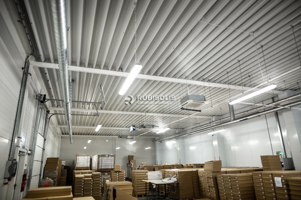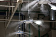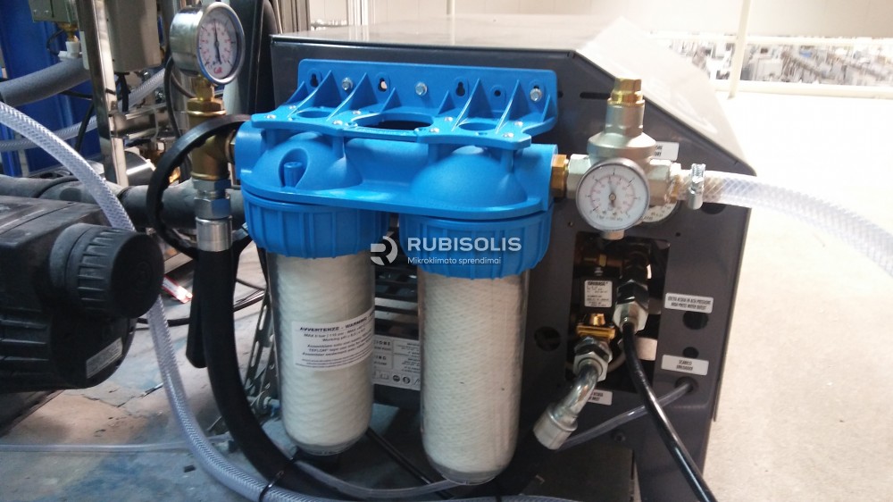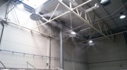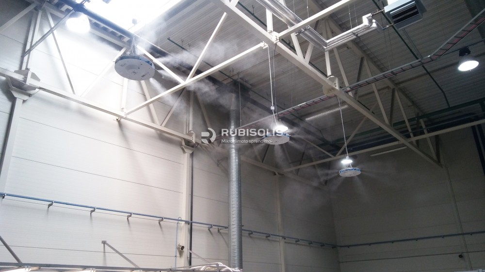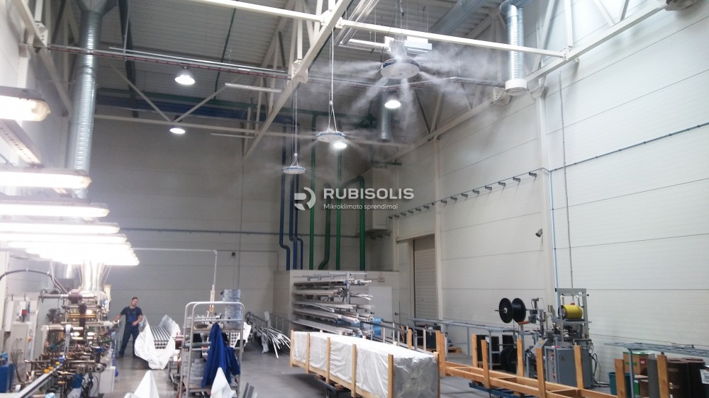 Oro drėkinimas gamybos ceche naudojant aukšto slėgio drėkinimo sistemą „Idrobase“.