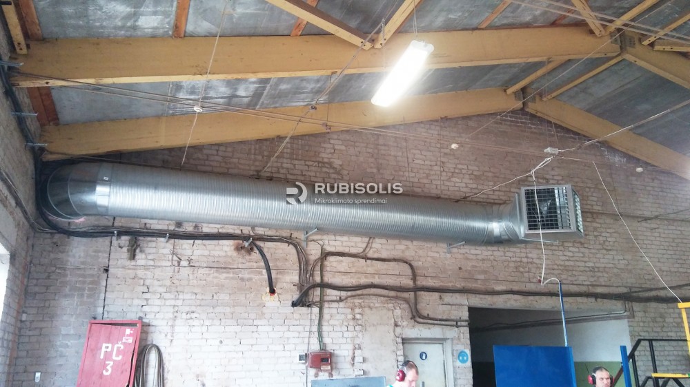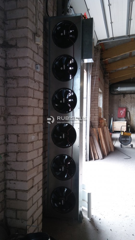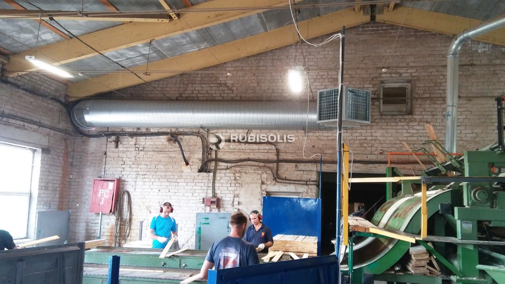 Baldų gamybos cecho vėsinimas pramoniniu vėsintuvu Aircon T30. Taip pat panaudota oro užuolaida, skirta sustabdyti šalto oro pritekėjimą į patalpą.