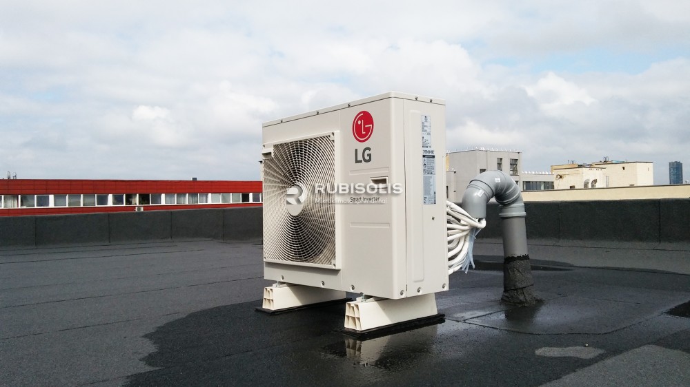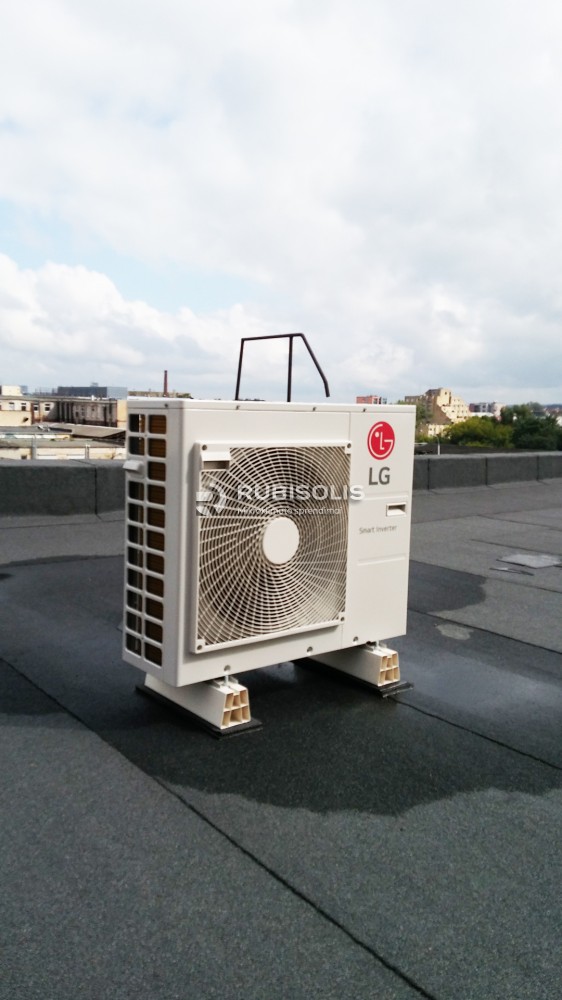 Šildymas-kondicionavimas biuro patalpose naudojant LG šilumos siurblių/oro kondicionierių multi-split sistemą: 5 vidiniai sieniniai blokai ir 1 išorinis blokas.