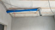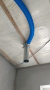 Namo vėdinimo sistemos įrengimas naudojant mėlynus lanksčius ortakius, difuzorių prijungimo dėžes ir akustines oro paskirstymo dėžes.