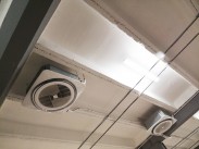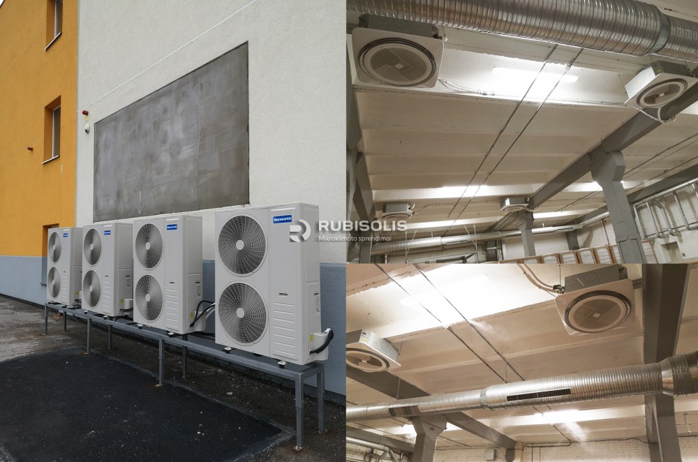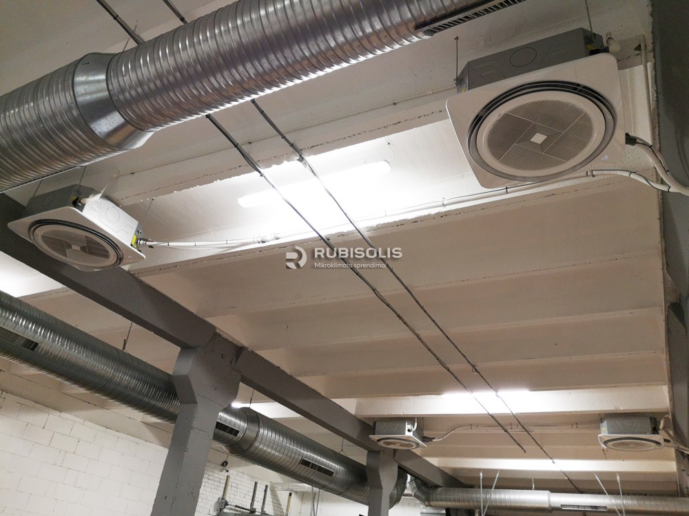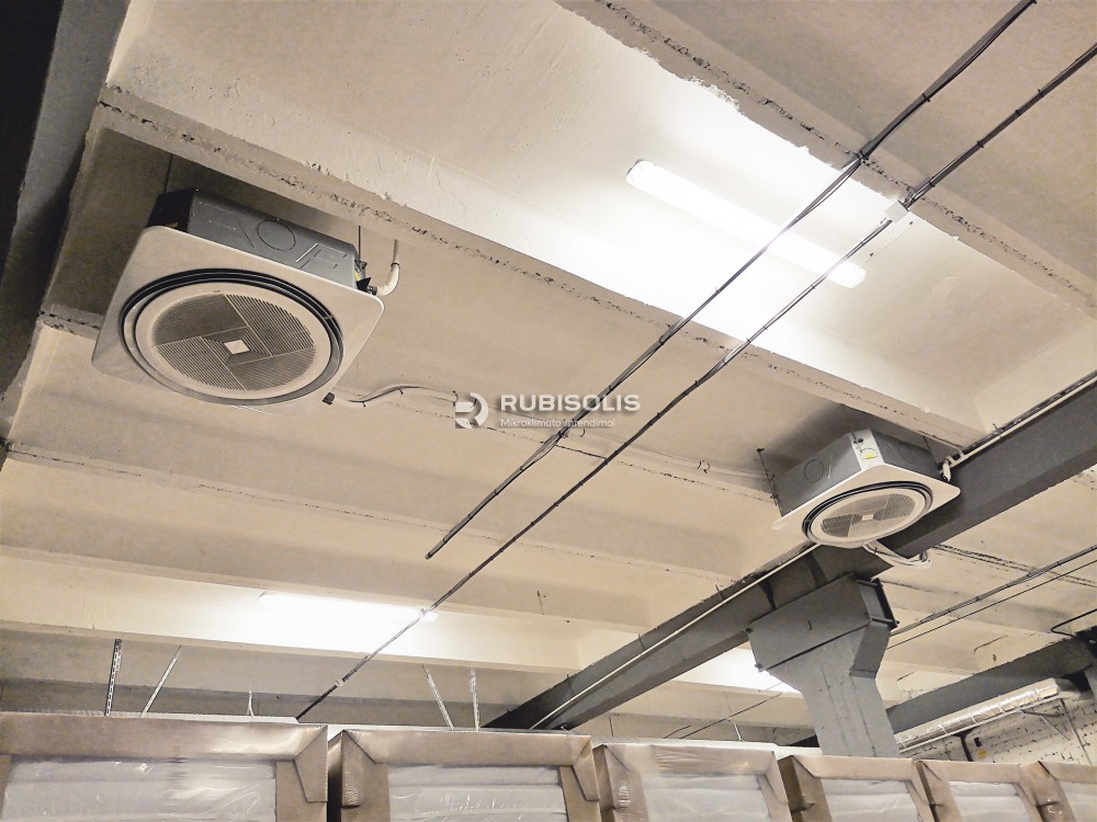 Šildymas-kondicionavimas filtrų gamybos patalpose naudojant šilumos siurblių/oro kondicionierių sistemos oras-oras išorinius blokus ir vidinius kasetinius blokus.