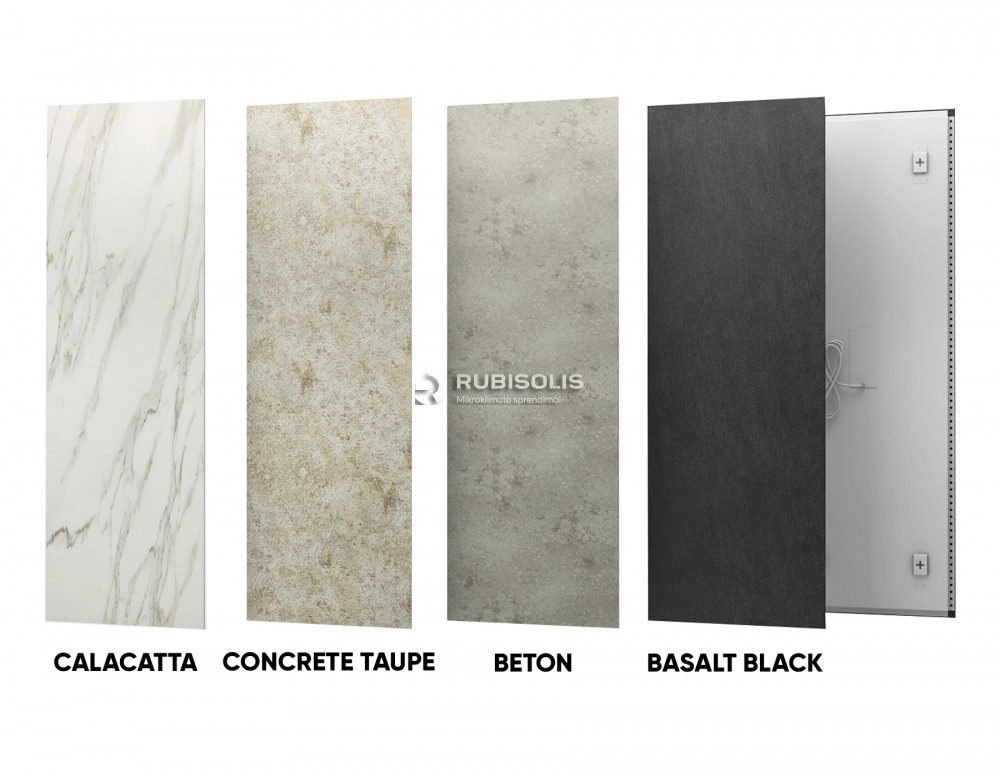 Keramikinės infraraudonųjų spindulių plokštės ECOSUN CR puikiai imituojančios natūralaus akmens išvaizdą, tinka restoranams, viešbučiams, ofisams, bei namams - vonios kambariams ir svetainėms. ECOSUN CR gali būti pakabintos tiek vertikalioje, tiek horizontalioje padėtyje. Ant plokščių gali būti sumontuoti rankšluosčių laikikliai. Siūlome 4 skirtingus plokščių spalvų variantus: „Concrete taupe“, „Beton“, „Calacatta“ ir „Basalt Black“. Kadangi plokštės yra natūralios akmens išvaizdos, gali šiek šiek skirtis jų medžiagos spalva ir tekstūra.