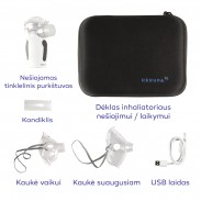 Herupa Smart Mesh – mobilus inhaliatorius. Naujos technologijos leidžia inhaliacijas atlikti kaip niekad lengvai ir efektyviai. Garai skleidžiami tik įkvėpiant, o nuožulni jų talpa leis sunaudoti vaistus maksimaliai. Prietaisas veikia visiškai be garso, tad juo galėsite naudotis net naktį, inhaliacija nesukels nemalonių jausmų vaikams ir netrukdys aplinkinių kasdieninei veiklai. Kompaktiškas ir lengvas, su komplekte esančia dėžute tilps bet kurioje rankinėje ar lagamine. Smart Mesh turi įkraunamą ličio bateriją, tad procedūrų netrukdys jokie nepatogūs laidai, jas galėsite atlikti lauke, kelionėje ar žygyje.