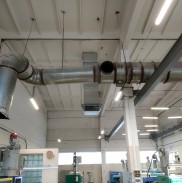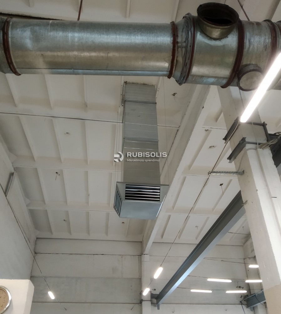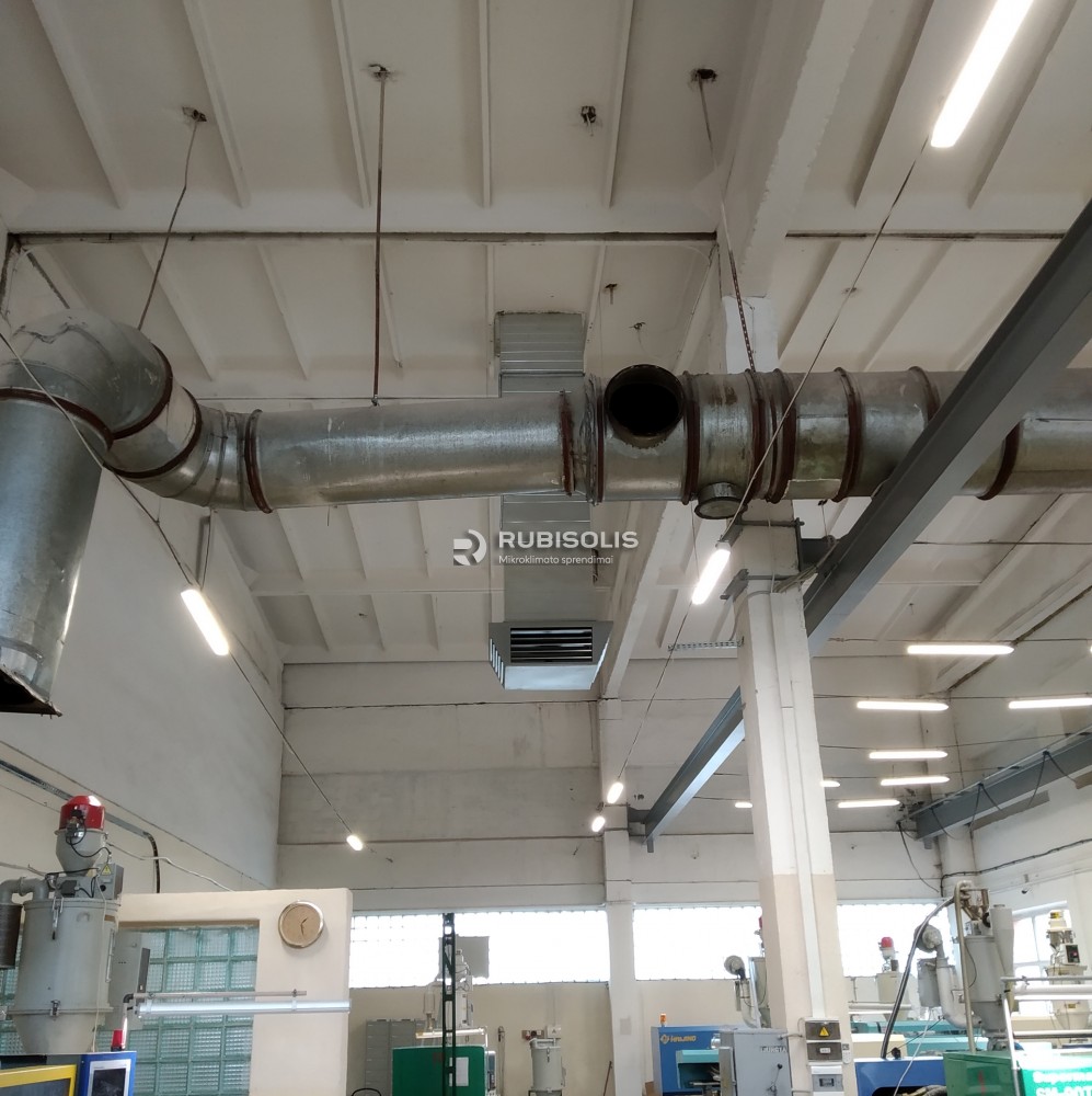 Plastiko gamyklos cecho vėsinimas pramoniniais vėsintuvais ir keturių krypčių oro paskirstymo difuzoriais.