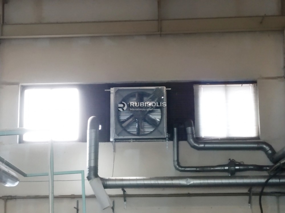 Plastiko gamyklos cecho vėsinimas pramoniniais vėsintuvais, ortakiais ir oro ištraukėjais.