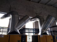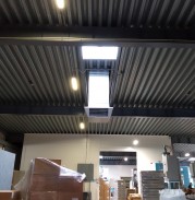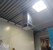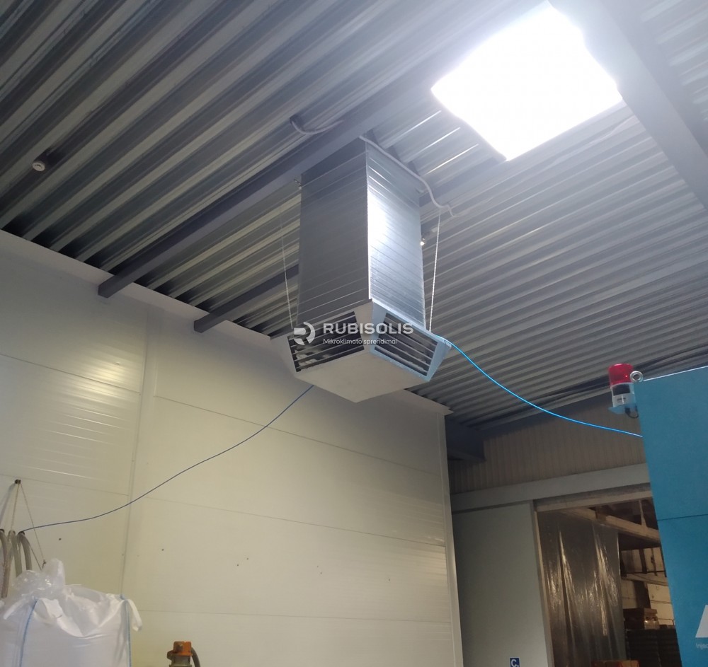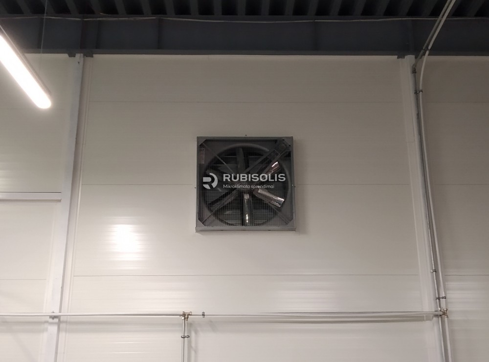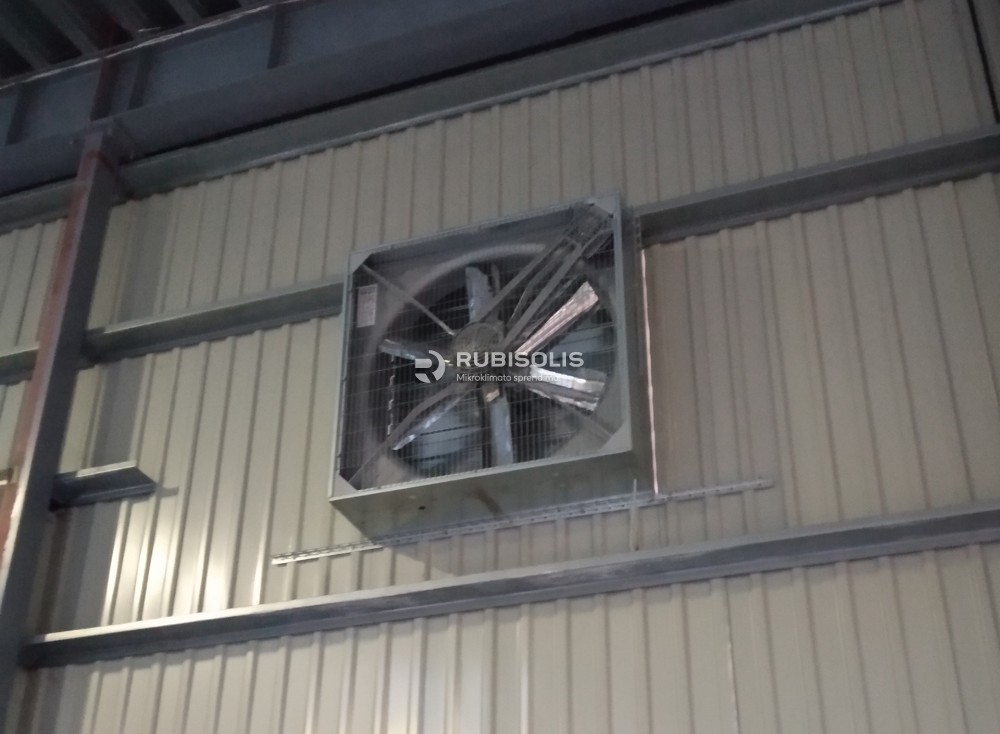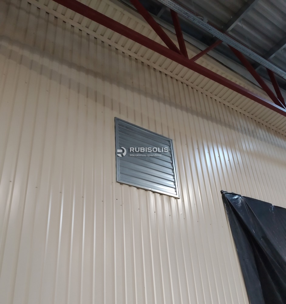 Plastiko gamyklos cecho vėsinimas pramoniniais vėsintuvais, keturių krypčių oro paskirstymo difuzoriais, oro ištraukimo ventiliatoriais.
