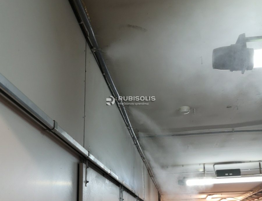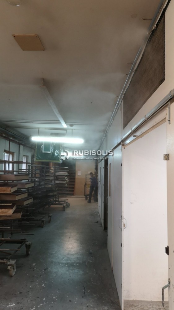 Oro drėkinimas keturiuose biliardo stalų gamybos cechuose naudojant aukšto slėgio drėkinimo sistemą.