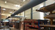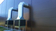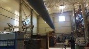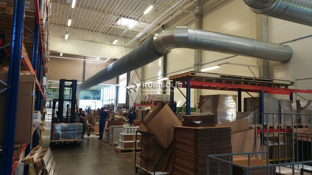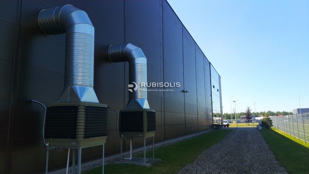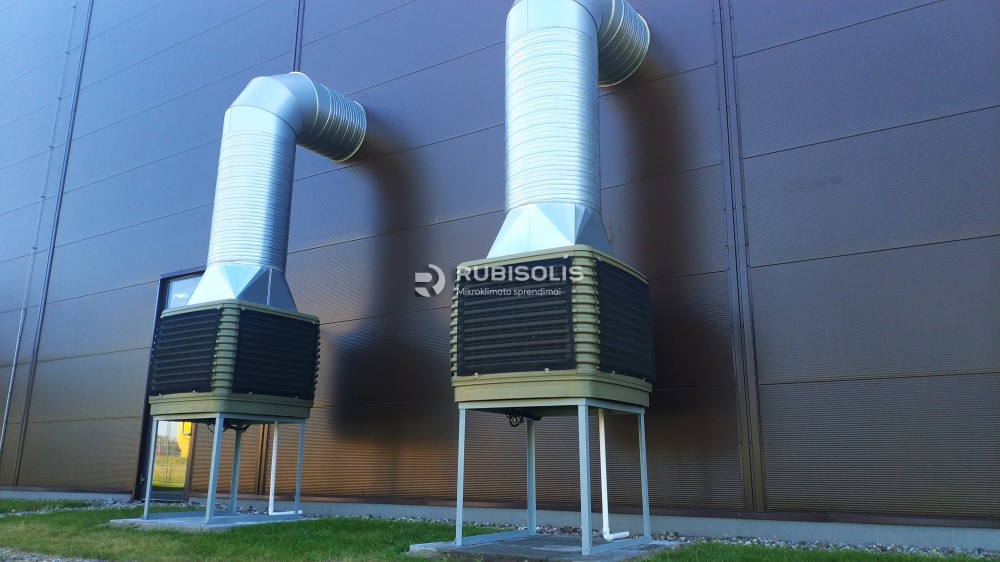 Baldų gamybos zonos patalpų vėsinimas pramoniniais vėsintuvais ir tekstiliniais ortakiais.