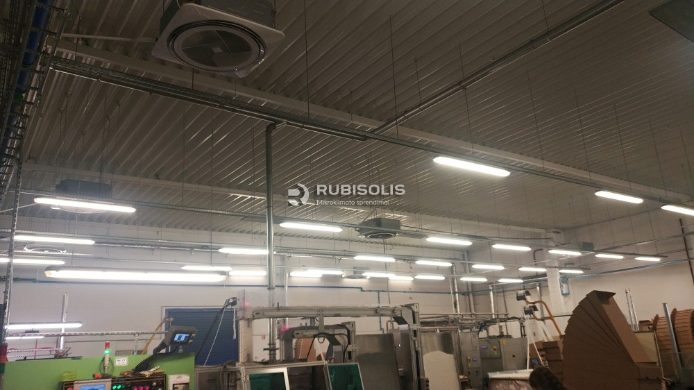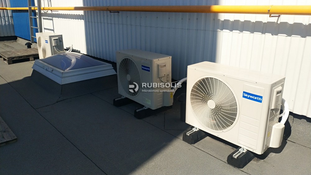 Oro kondicionavimas gamybos patalpose naudojant oro kondicionierių/šilumos siurblių Skyworth išorinius blokus ir vidinius kasetinius blokus.