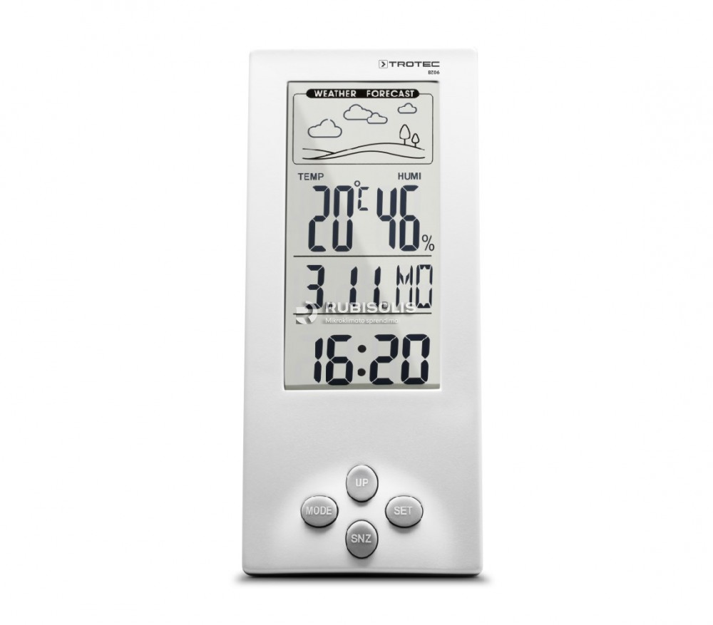 Šiuolaikiško dizaino meteorologinė stotelė BZ 06 vos žvilgtelėjus perteikia informaciją apie patalpoje esantį klimatą. Skaitmeniniame ekrane dideliais skaitmenimis nurodoma esama patalpų temperatūra (°C arba °F), drėgmės lygis (%), data, savaitės diena ir laikas 12 arba 24 valandų formatu. Be to, grafiškai parodyta orų prognozė rodo artėjančius orų pokyčius. Dar daugiau, šioje stotelėje įmontuotas žadintuvas su atidėjimo funkcija. BZ 06 galite pastatyti visur, kur jums patinka: svetainėje, virtuvėje, vaikų kambaryje, miegamajame, vonios kambaryje, darbo vietoje ar net pasiimti su savimi į kelionę. Orų stotelė neskleidžia jokių garsų, todėl netrukdys net miegant.
