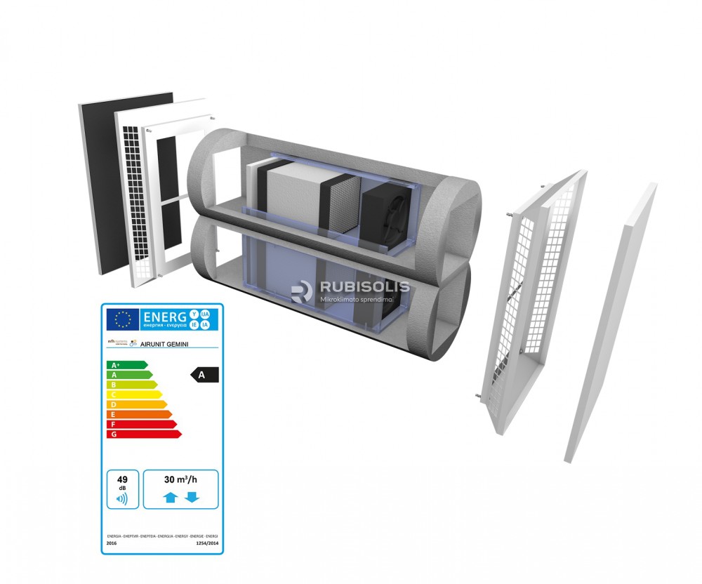 „AIRUNIT GEMINI“ dvisrautis mini rekuperatorius montuojamas sienoje. Jį sudaro du energiją taupantys ir triukšmą mažinantys ventiliatoriai, du šilumos akumuliatoriai bei du ISO „Coarse 50%“ filtrai, todėl vieno prietaiso pakanka patalpoms iki 25 m². Mini rekuperatoriuje įmontuotas ypač efektyvus šilumokaitis, kurio naudingumo koeficientas siekia 98% (geriausiomis sąlygomis), todėl į patalpą tiekiamas gaivus oras, kurio temperatūra yra panaši į patalpos temperatūrą. Tokiu būdu ženkliai sumažinami šilumos nuostoliai, kurie atsiranda vėdinant įprastu būdu (atidarant langą).