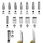 “15 in 1 “ daugiafunkciniame įrankyje yra 3 kryžminio atsuktuvo antgaliai (PH1, PH2, PH3), 2 plokščio atsuktuvo antgaliai (5 mm, 6 mm); 2 šešiakampio atsuktuvo antgaliai ( H5, H6) bei 4 šešiakampės atsuktuvo galvutės (6, 8, 9, 10 mm). Pridedamas papildomas keturkampis adapteris (1/4"), leidžiantis prie magnetinio 1/4" šešiakampio laikiklio prijungti atsuktuvo galvutes. Spyruoklinis rutulinis guolis, integruotas į kvadratinę adapterio galvutę, užtikrina tvirtą jungtį. Taip pat, įrankyje įmontuoti 2 lenktiniai peiliukai: tiesus ir dantytas
