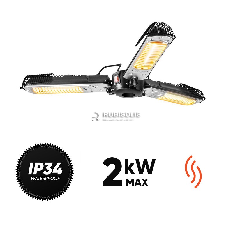 Halogeninis infraraudonųjų spindulių šildytuvas Umbrella IR 2005 SC - protingai suprojektuotas 3 sparnų spindulinis šildytuvas specialiai sukurtas nesudėtingam tvirtinimui po beveik bet kokiu lauko skėčiu, kad sode, lauko restoranuose ir baruose, lauko renginiuose ir mugėse suteiktų malonią šilumą neužimdamas papildomos vietos.