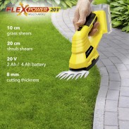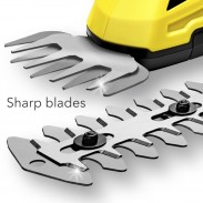 Maloniai lengvos (1 kg) akumuliatorinės žirklės turi keičiamus žolės ir krūmų kirpimo priedus su paprasta antgalių keitimo sistema. Su šiuo įrankiu galite atlikti beveik visus kiemo ir sodo želmenų genėjimo, formų pjovimo ir priežiūros darbus, Jums nereikės nuolat keisti skirtingų įrankių. Peilių geležtės šlifuotos iš abiejų pusių bei pagamintos iš aukštos kokybės ir tvirto plieno, todėl garantuoja puikų pjovimo efektyvumą ir ilgą tarnavimo laiką.
