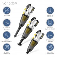 Su šiuo rankiniu dulkių siurbliu be vargo sutvarkysite trupinius ant kietų grindų ir kilimų, gyvūnų plaukus ant sofos, kačių kraiką ar purvą ant laiptų, dulkes automobilyje ar išlietą nedidelį skysčių kiekį. Beveik nieko nėra namuose, biure, kemperyje, mikroautobuse ar automobilyje, ko maloniai lengvas rankinis dulkių siurblys VC 10-20V negali greitai ir visiškai pašalinti su komplektacijoje esančiais šlapiam ar sausam turiniui skirtais antgaliais.