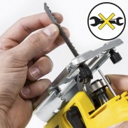 - Greitai atleidžiamas griebtuvas, skirtas be įrankių pakeisti pjūklo geležtę per kelias sekundes;