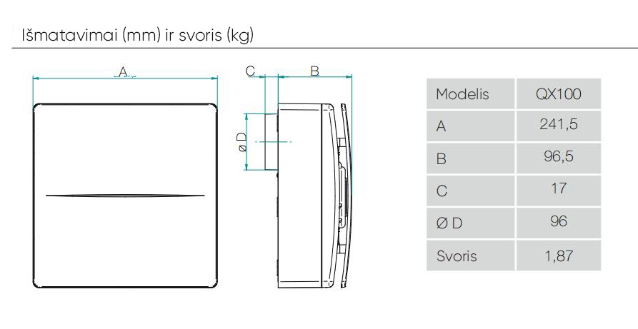 Ištraukimo ventiliatorius Aerauliqa Quantum AX su 100 mm diametro ašiniu ventiliatoriumi nuolatiniam veikimui.