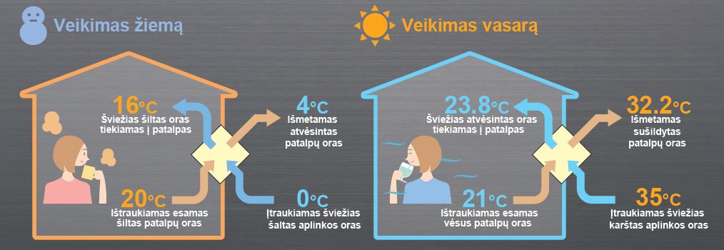 - Aukštas temperatūrinių mainų efektyvumas – 73/80 %;