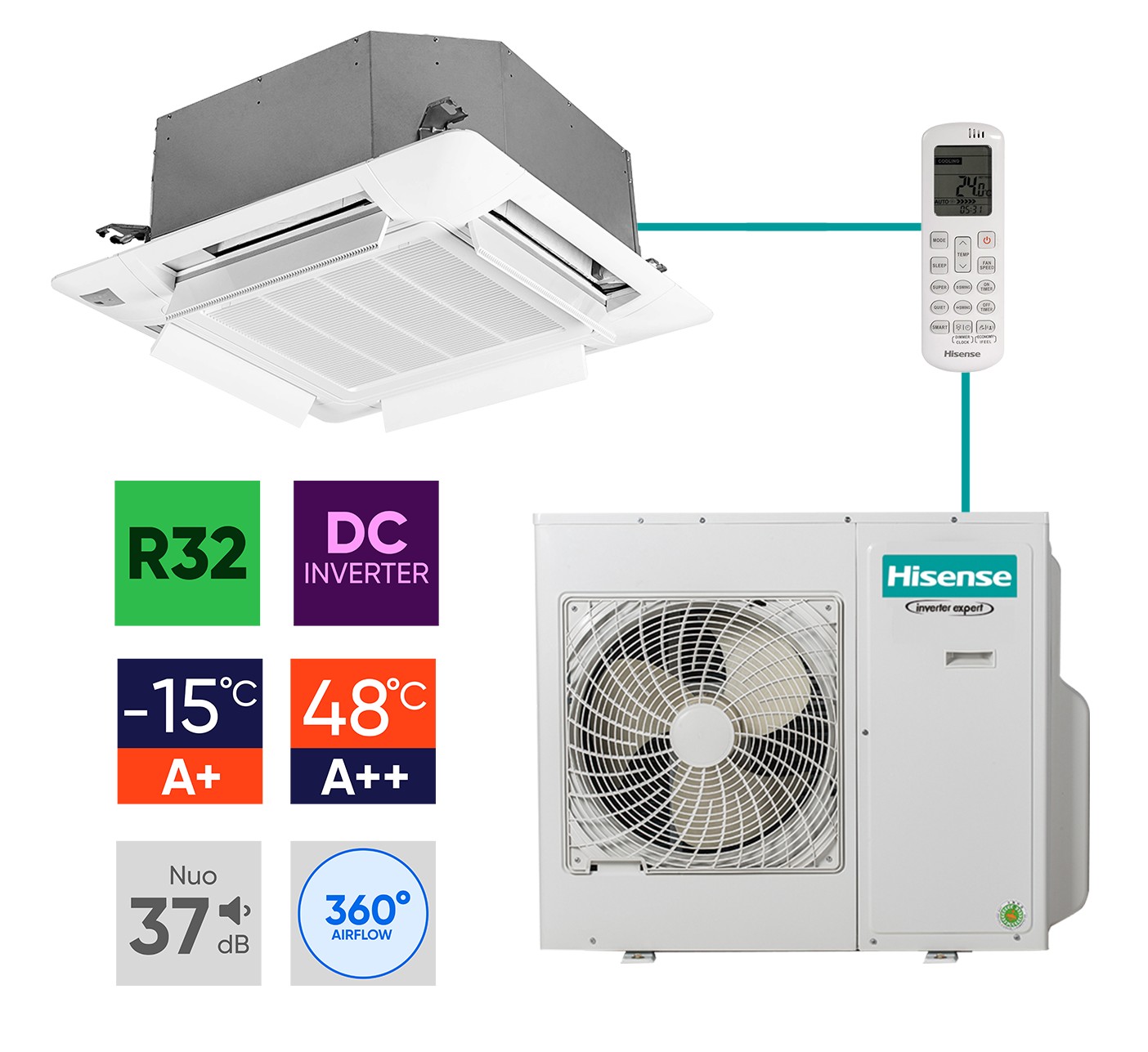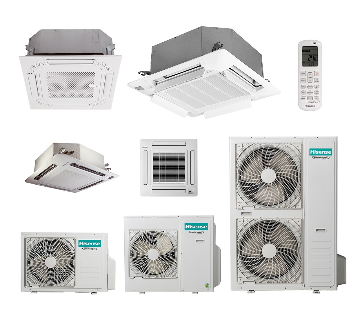 - Kasetinės — vidinis blokas dažniausiai montuojamas į lubas, siekiant kompaktiškumo. Kasetinės sistemos rekomenduojamos erdvesnėse patalpose, kur sienos yra atitolusios viena nuo kitos, o lubų aukštis didesnis. Oras išpūčiamas į šonus keturiomis kryptimis, taip užtikrinant efektyvų vėsaus/šilto oro pasiskirstymą.