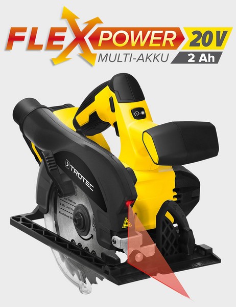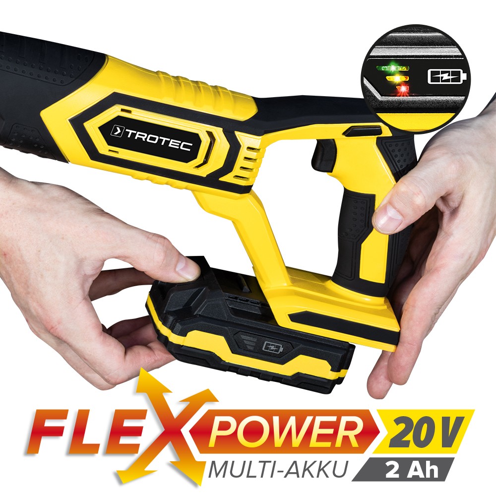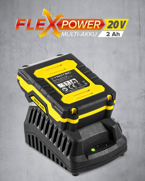 Galinga ir ilgaamžė „Flexpower“ 20V / 2Ah ličio jonų baterija užtikrina patvarią ir nuolat didelę pjovimo galią. Korpuse integruota 3 pakopų akumuliatoriaus lygio indikacija rodo akumuliatoriaus būseną, net jei baterija nėra prijungta prie įrenginio. Naudojant greitą įkroviklį, visiškai išsikrovusi baterija vėl bus paruošta naudoti po 1 valandos. „Flexpower“ kelių įrenginių baterija taip pat gali būti naudojama su kitais „Trotec“ įrankiais.