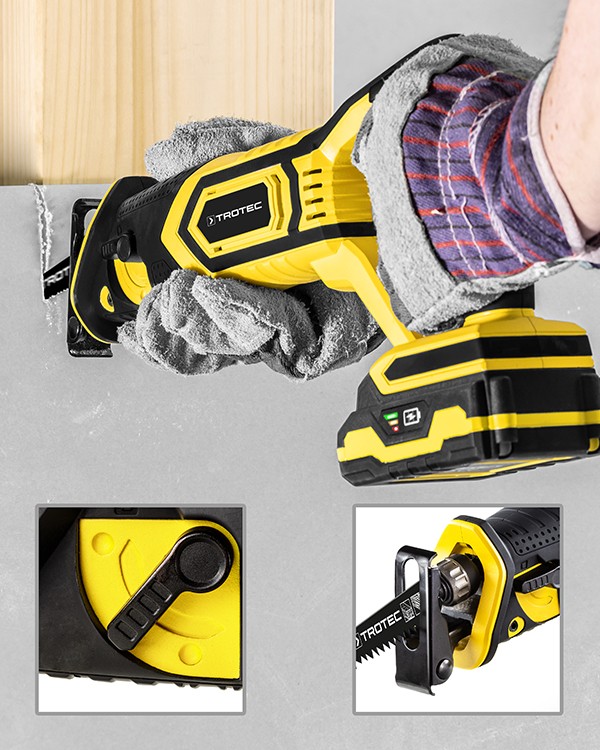 Prietaise sumontuotas greitojo ašmenų atleidimo griebtuvas, kuriame galima įtvirtinti medienai ir metalui pjauti skirtas pjūklo geležtes su S formos koteliais ir universaliais ½” koteliais bei lanksčias bimetalines pjūklo geležtes, skirtas pjūviams prie pat plokštumos. Pakeisti pjūklo geležtes galima nenaudojant įrankių. Dar daugiau, Trotec PRCS 10‑20V įtaisyta įjungimo blokuotė, kad įrenginys netikėtai neįsijungtų. Taip pat, prietaisui veikiant galima tolygiai reguliuoti pjūklelio judesių skaičių nuo 0 iki 3000 min-1.