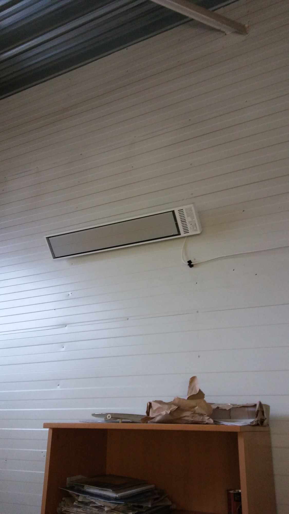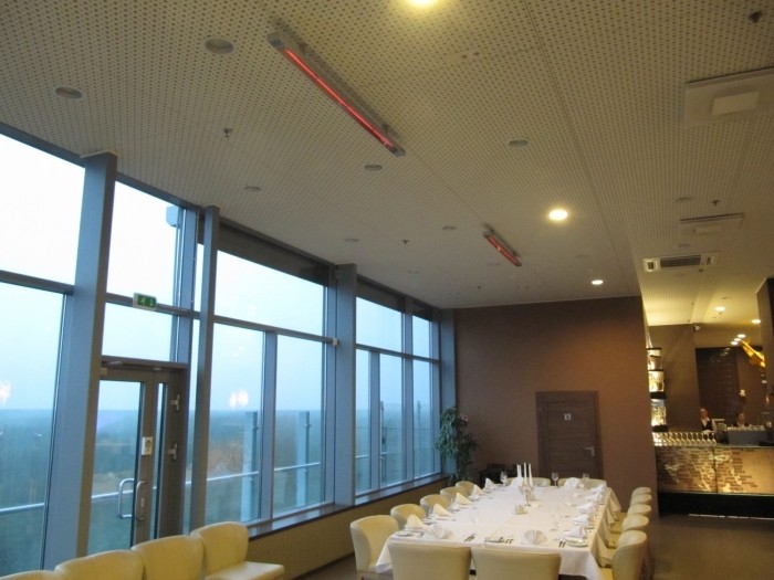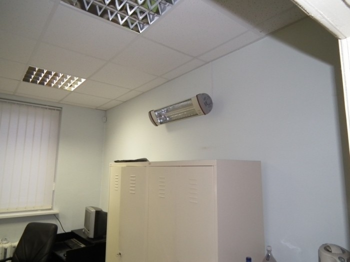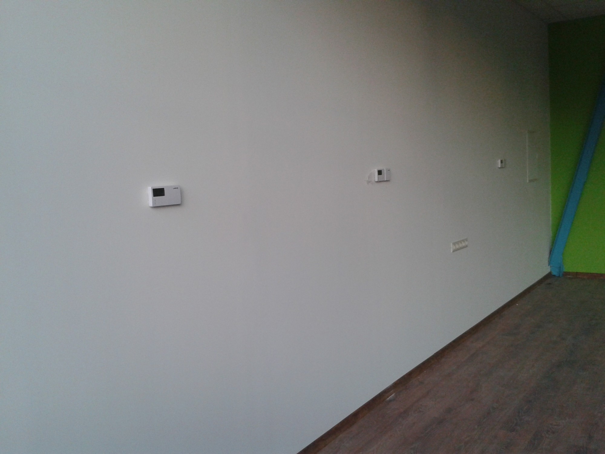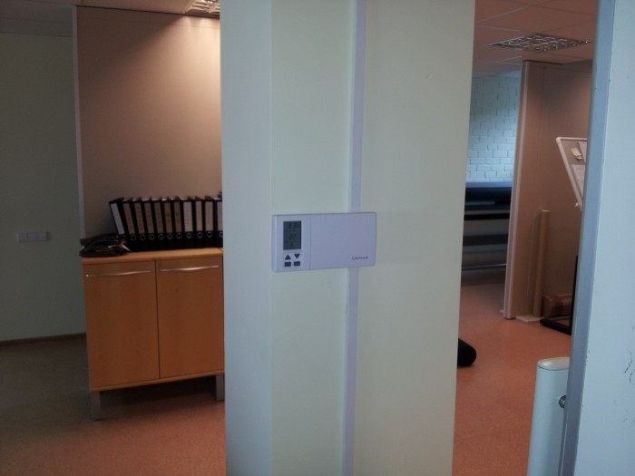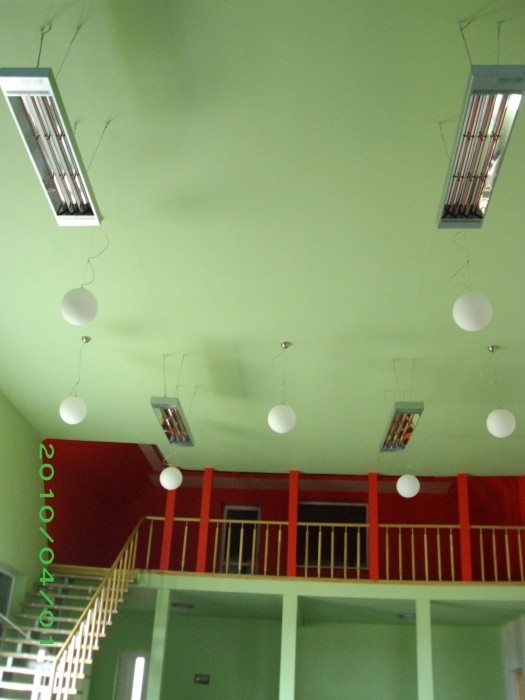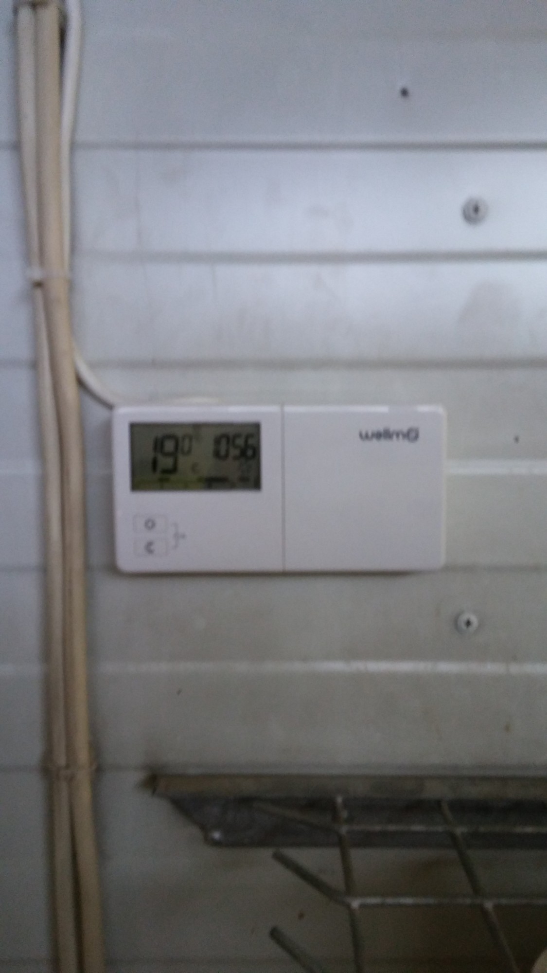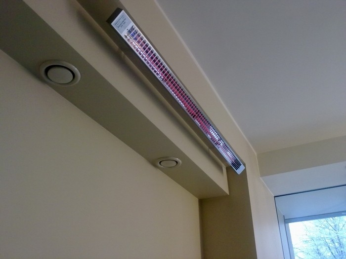 Patalpoms šildyti buvo įrengti 8 EE24 Energotech šildytuvai ir VEITO Pietra S (papildomas šildymas virš kavos staliuko). Šildytuvai valdomi WTH25.08 termostatais. Patalpa padalinta į dvi dalis, kuriuose naudojami du programuojami termostatai ir 8 EE24 šildytuvai. Vienas termostatas valdo 4 šildytuvus (iš viso 9,6 Kw). Naudojamas trifazis (~380V) elektrinis maitinimas. Kiekvienas šildytuvo kaitinimo tenas prijungtas prie atskiros fazės, taigi, užsakovas turi galimybę naudoti nuo 1 iki 3 katinimo tenus vienu metu ir tokiu būdu koreguoti bendrą šildytuvų galingumą (kiekvienai fazei yra įrengtas atskiras jungiklis).
